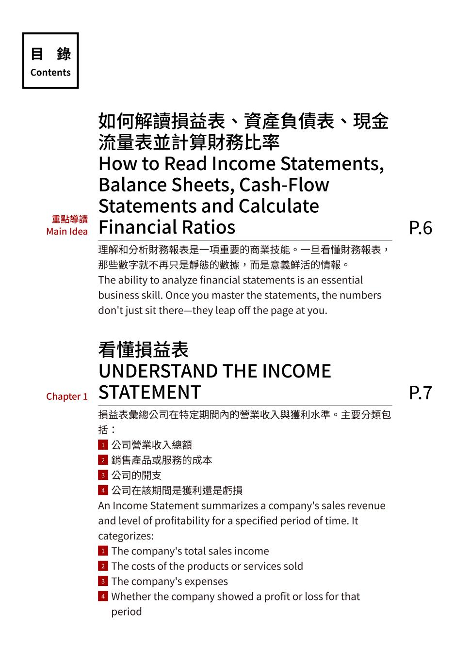 重點導讀 Main Idea如何解讀損益表、資產負債表、現金流量表並計算財務比率 How to Read Income Statements, Balance Sheets, Cash-Flow Statements and Calculate Financial Ratios▶▷ 有聲導讀 請點此